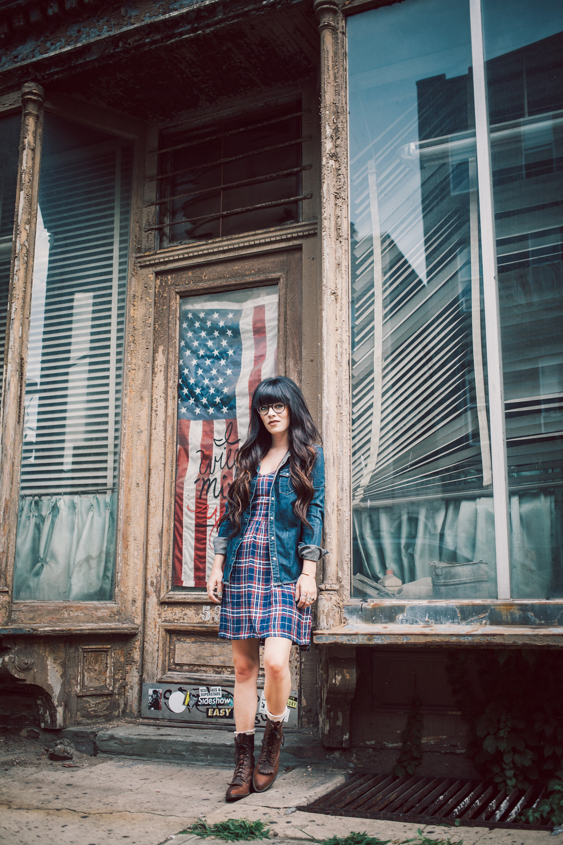 In this look… Glasses c/o Trioo, vintage boots, Dress from Abercrombie and thrifted Allsaints denim shirt.